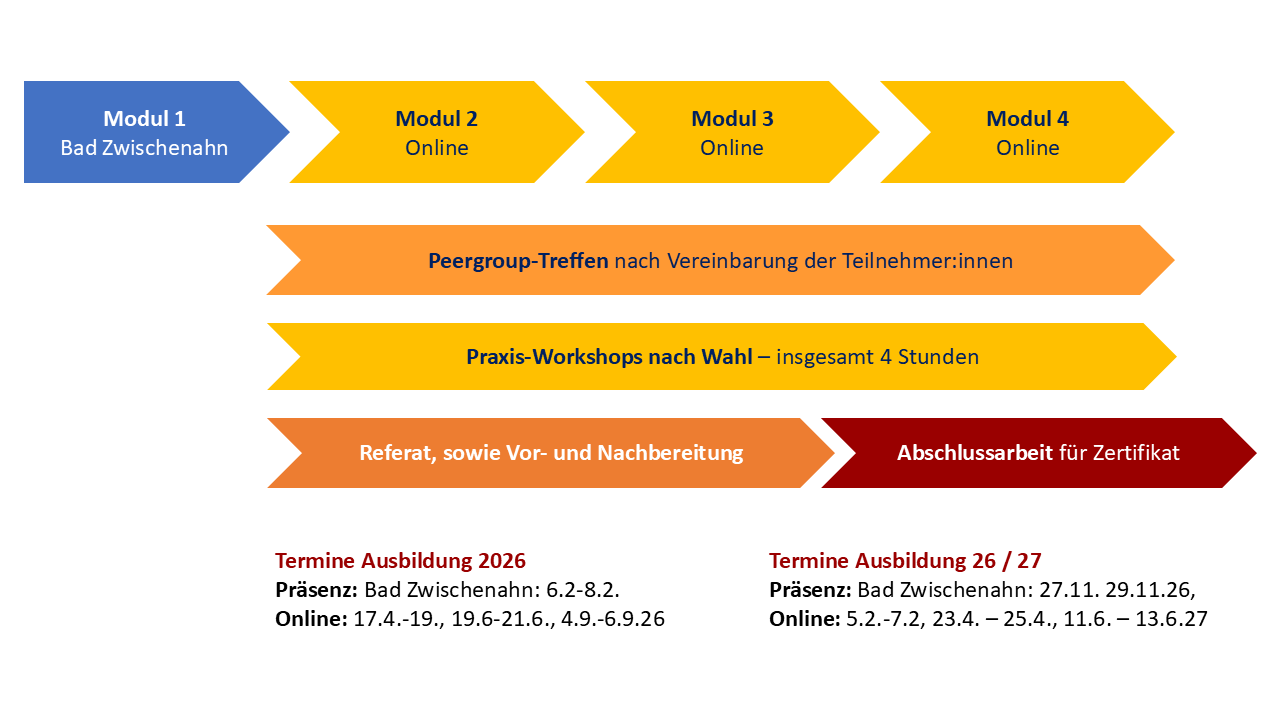 4 Kompaktseminare plus 2 Zoom-Treffen, Praxis-Workshops, Peergrouptreffen, ForumTermine